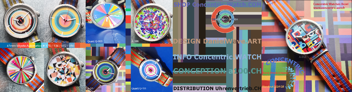 CONCENTRIC-WATCH COM - A SWISS INNOVATION The first serial product individually designed worldwide*. With the help of our software random algorithm and a partial collection of AI made designs What has long been established in art and handicrafts could soon subwave a100 is taking on a pioneering role and started producing several Based on the concept of Swiss architect Daniel Schulthess, each watch is a small, The watches are characterized by high-quality components and will be released *There are unique industrial products in series in print products like T-Shirts or within the characteristics of (recycled) materials, - like the FREITAG bags - but a web search finds no other product comparable to our unique watch. Of course, artisans and watchmakers always made smaller series of unique pieces - but not 500 or several 1000 in a factory. |